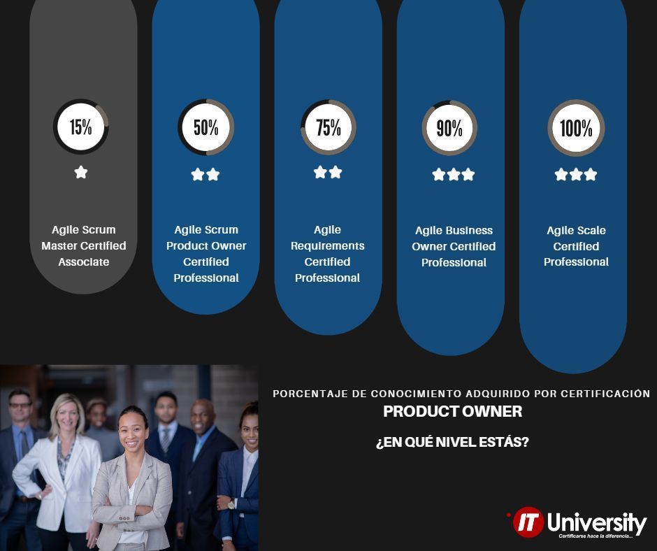 Estas graficas te daran una vision mas clara porcentaje de conocimiento adquirido por cada certificación de agilidad y Scrum que vamos logrando al certificarnos en los diferentes niveles y podras consultar las rutas disponibles de aprendizaje.
